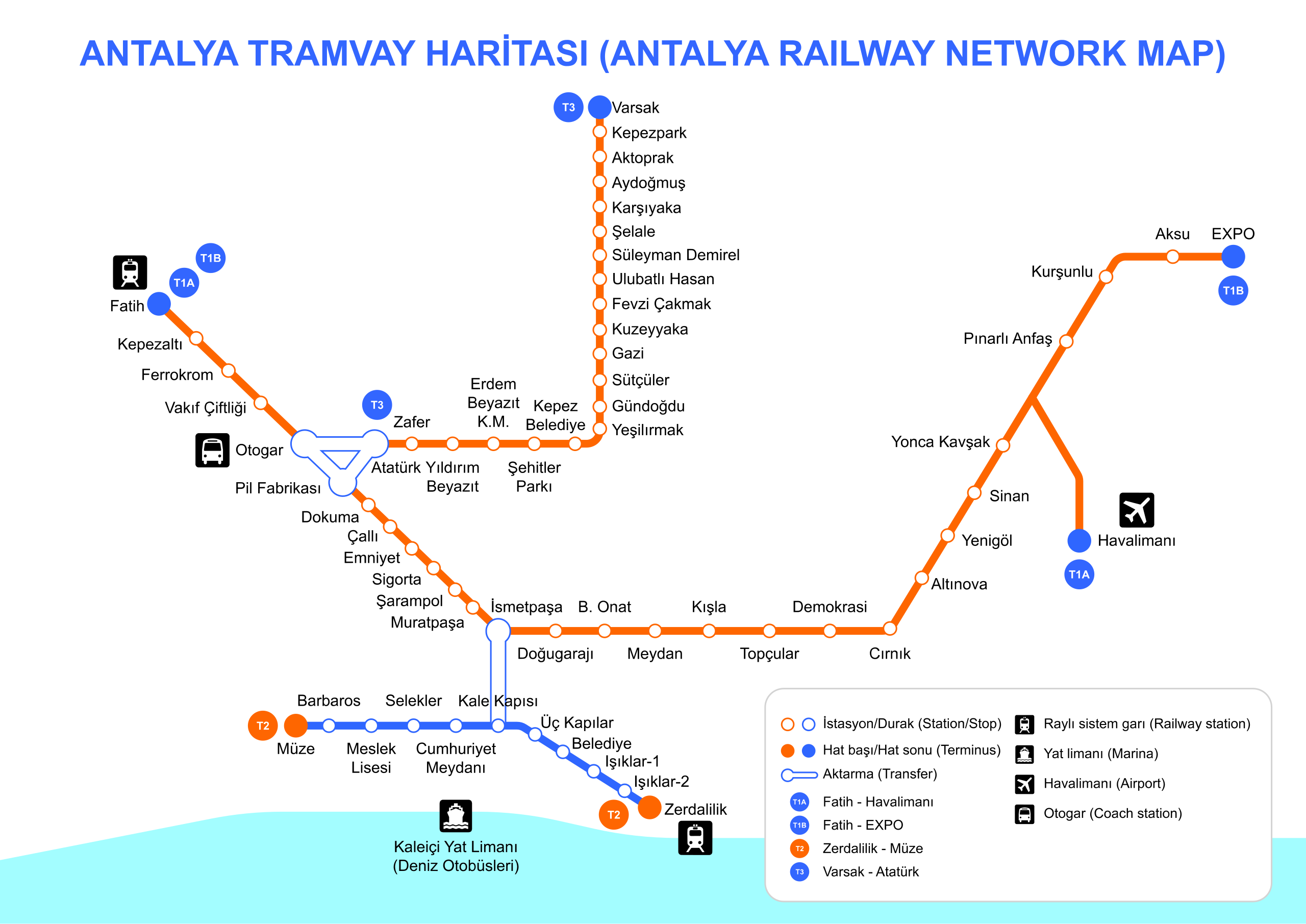 Современная трамвайная линия Антальи — лучший способ добраться из аэропорта (Havalimanı) прямо до главного автовокзала (Otogar). С автовокзала можно пересесть на автобусы до Аланьи, Кемера, Сиде и других курортов.